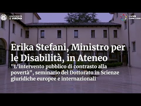 La ministra per le Disabilità Erika Stefani ospite dell’ateneo di Verona, nella sala Jacopo D’Ardizzone del dipartimento di Scienze giuridiche, in occasione del seminario “L’intervento pubblico di contrasto alla povertà” del corso di dottorato in Scienze giuridiche europee ed internazionali. All’appuntamento, organizzato da Jacopo Bercelli, docente di Diritto amministrativo, sono intervenuti, tra gli altri, il prorettore Roberto Giacobazzi e il direttore del dipartimento Stefano Troiano.
