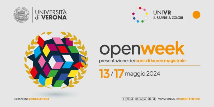 Ritorna l’Open Week all’università di Verona: un’occasione per conoscere e confrontarsi sulle opportunità offerte dall’ateneo scaligero. Dopo l’evento di gennaio dedicato ai corsi triennali e magistrali a ciclo unico, dal 13 al 17 maggio i docenti dell’università veronese presenteranno i corsi di laurea magistrale attraverso una serie di incontri dedicati a studentesse e studenti, famiglie e docenti degli istituti superiori.