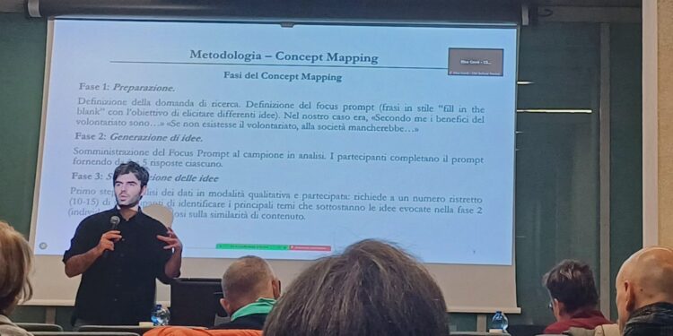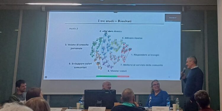A evidenziare la metodologia omologata nella ricerca e i risultati relativi è stato Francesco Tommasi, docente del dipartimento di Scienze umane: “Per svolgere questo progetto abbiamo seguito tre direttive diverse, sono sostanzialmente tre macro-studi diversi che sono stati realizzati. Per farvi capire i risultati abbiamo usato questa metodologia che si chiama “concept mapping” ovvero mappatura del concetto”, mostrando che “per i tre studi con 105 partecipanti membri del direttivo abbiamo ottenuto 76 risposte diverse sulla domanda quali sono i benefici del volontariato”.